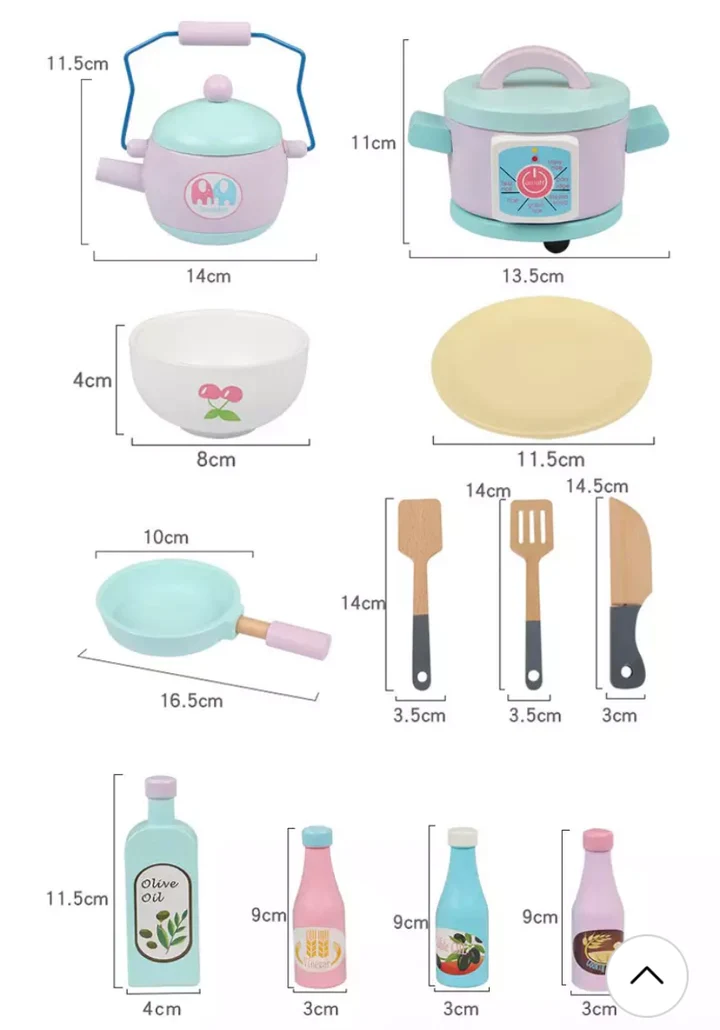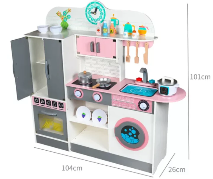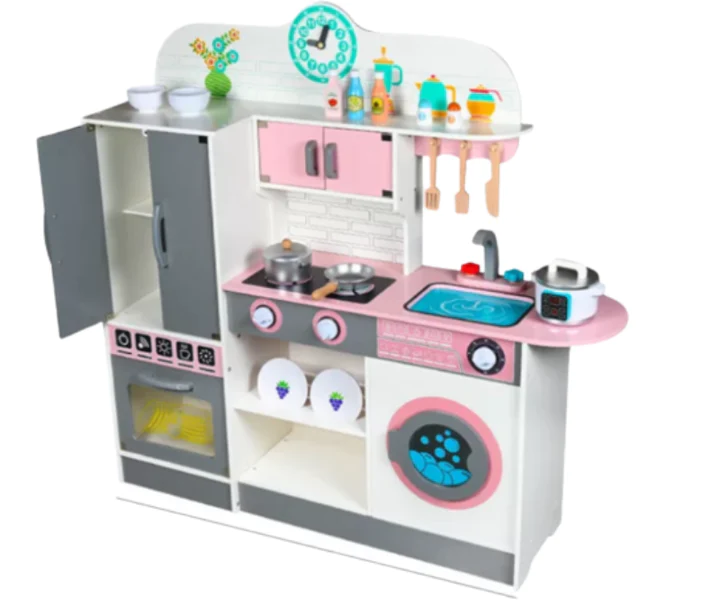 مطبخ لعب الأطفال هذا مجهز بموقد وحوض وغسالة ودرج وساعة وإكسسوارات المطبخ.